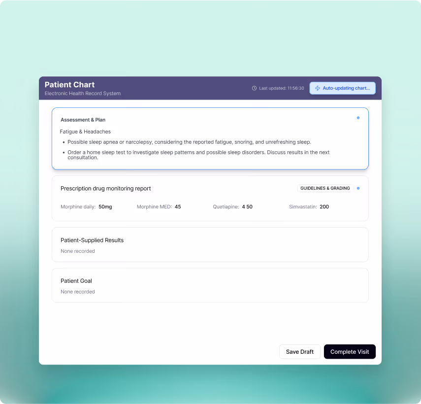 Real-time guidance to flag gaps, prompt clarifications, and ensure coding-compliant notes.