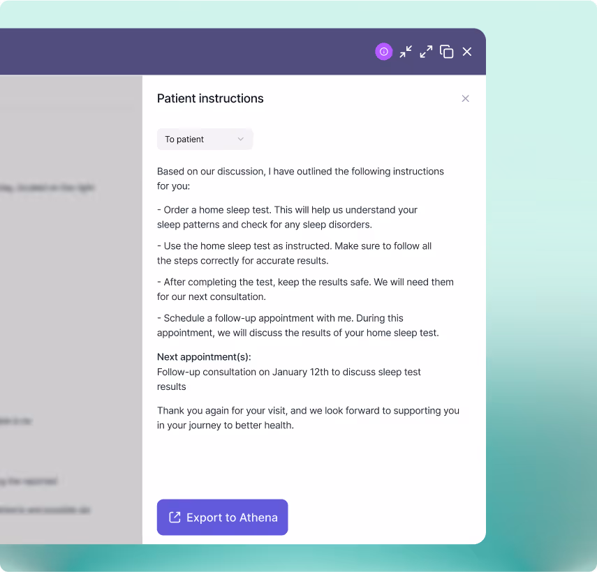 Patient instructions generated by Nabla can be exported to the patient chart in one click using the “Export to Athena” button at the bottom of the instructions.